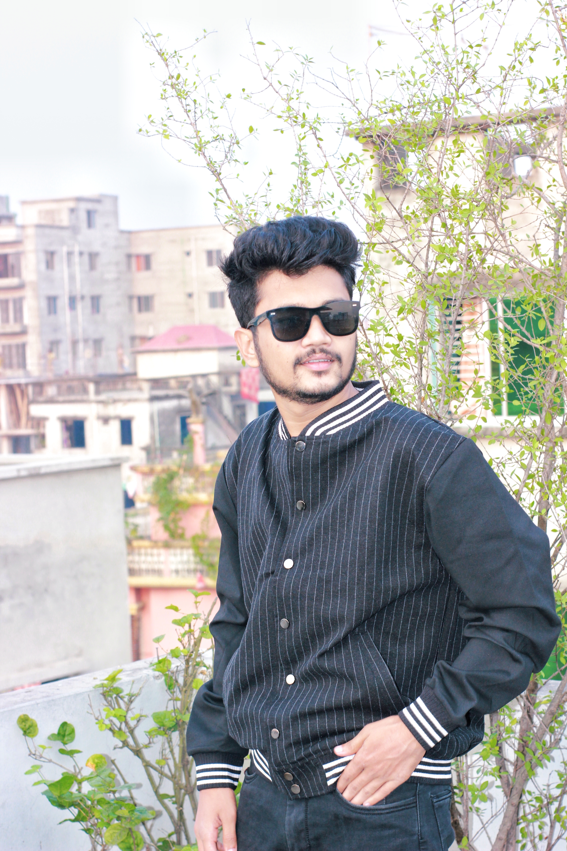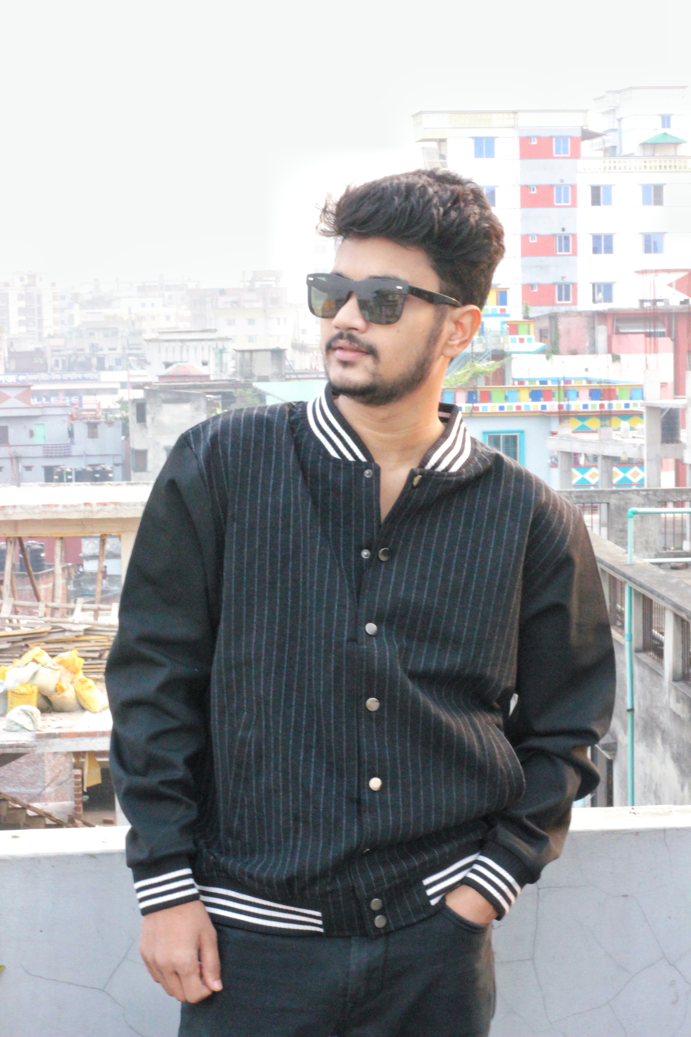 A perfect blend of casual confidence and modern streetwear. This look features a sleek black varsity jacket paired with bold shades creating a stylish statement for the trendsetters who love standing out effortlessly. Ideal inspiration for your everyday urban fashion vibe.