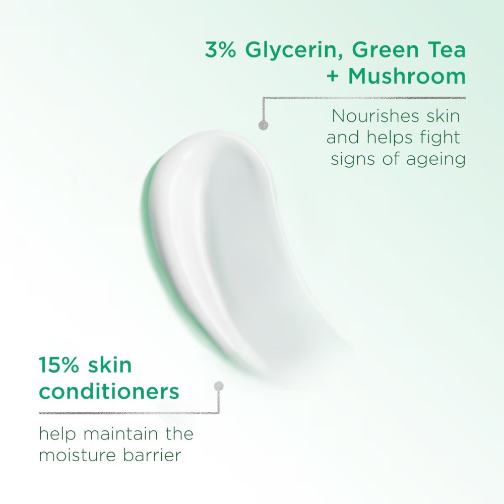 - Enriched Blend: Formulated with 3% Glycerin (for hydration), Green Tea, and Mushroom Extract (Fomes Officinalis) to replenish and soothe.